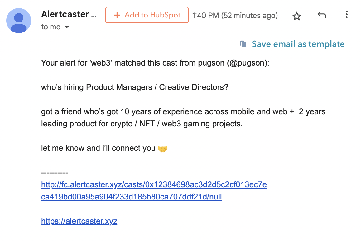 As-it-happens emails are plain text and contain a link to open the cast in the Farcaster app (desktop or mobile). Alerts are delayed about 30 minutes due to the Farcaster APIs and cast indexing process, but this is expected to be eliminated in early 2023.